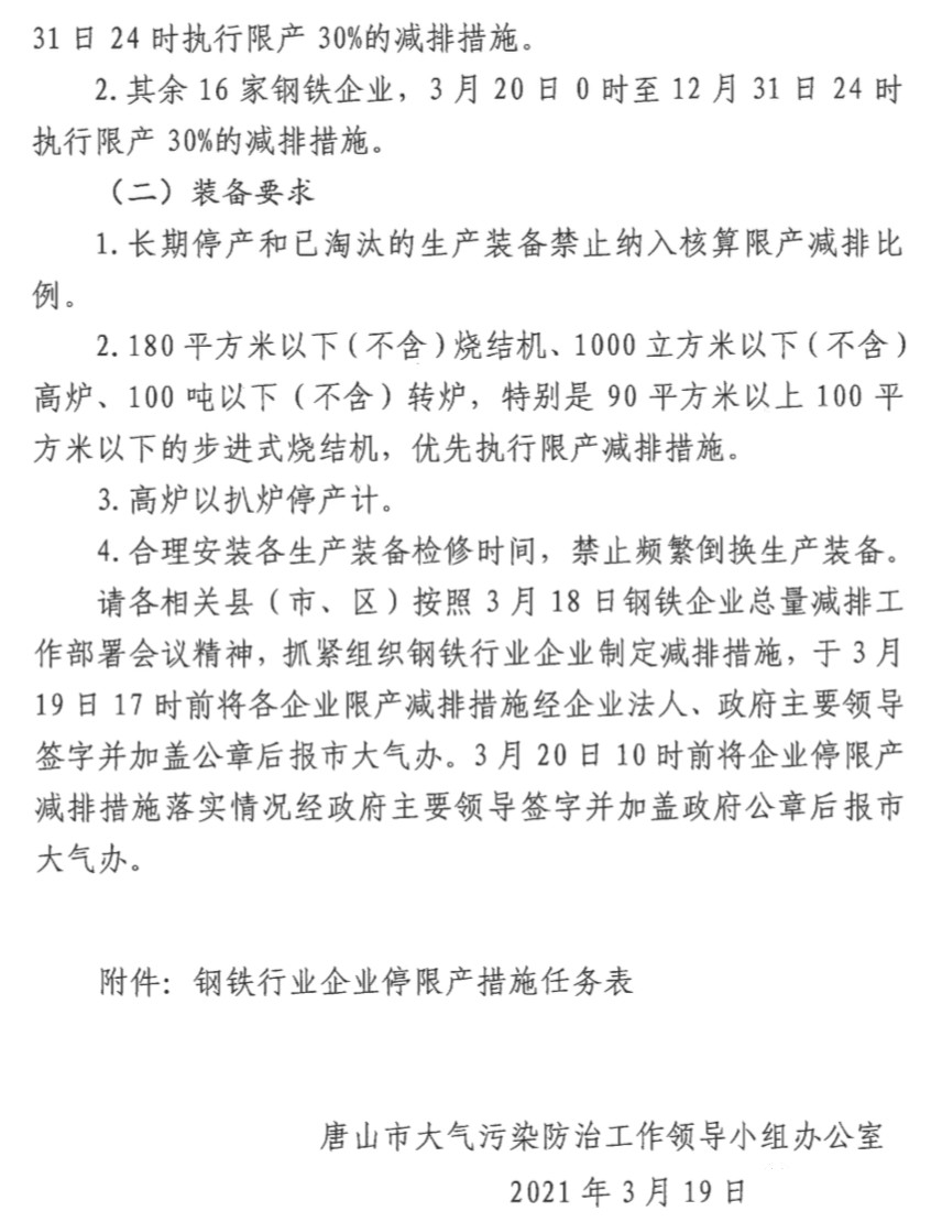 2、唐山燕山鋼鐵有限公司、遷安市九江線材有限責(zé)任公司、河北榮信鋼鐵有限公司3家鋼鐵企業(yè),3月20日0時(shí)至12月31日24時(shí)執(zhí)行限產(chǎn)30%的減排措施。