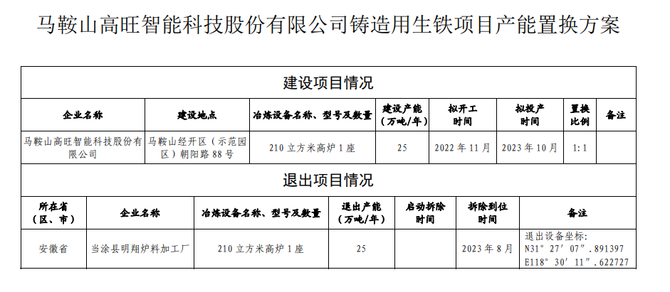 關于馬鞍山高旺智能科技股份有限公司210立方米鑄造用生鐵高爐項目產(chǎn)能置換方案的公示