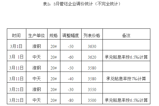 上面列舉的是各個(gè)城市的價(jià)格調(diào)整,以下是幾個(gè)主要管坯企業(yè)在本月內(nèi)的調(diào)價(jià)政策,可以看的出在這一個(gè)月中管坯企業(yè)的價(jià)格大致走向: