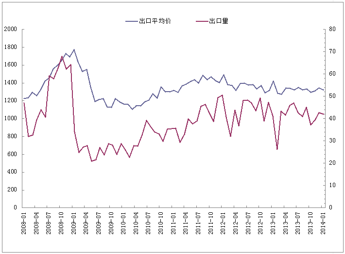圖6:2008年到2014年2月我國無縫管出口量與其出口平均單價(jià)的曲線圖(單位:萬噸)