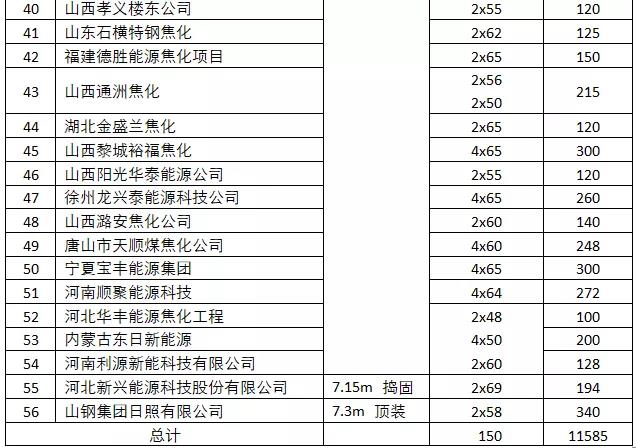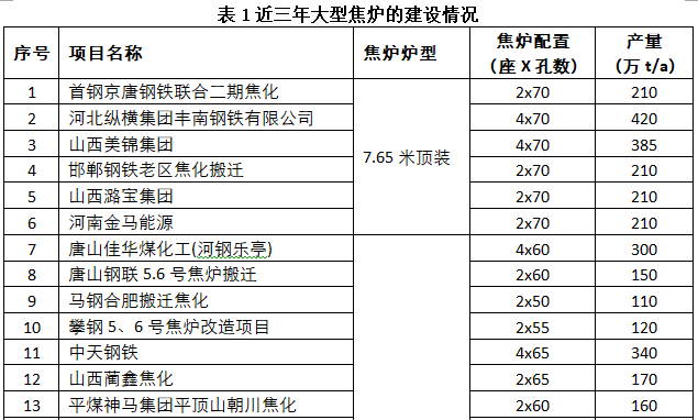 按照《產(chǎn)業(yè)結(jié)構(gòu)調(diào)整指導(dǎo)目錄》(2019年本)和《焦化行業(yè)規(guī)范條件》的要求,新建焦?fàn)t的頂裝焦?fàn)t炭化室高度須≥6.0米,搗固焦?fàn)t炭化室高度須≥5.5米。近10年來(lái),焦?fàn)t裝置一直向大型化發(fā)展,下表為收集近三年的6米及以上的焦?fàn)t項(xiàng)目,供讀者參考。