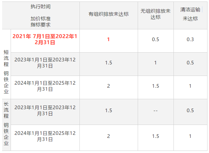 根據(jù)有資質(zhì)的監(jiān)測(cè)機(jī)構(gòu)和有能力的技術(shù)機(jī)構(gòu)出具的鋼鐵企業(yè)超低排放評(píng)估監(jiān)測(cè)報(bào)告,對(duì)全省未按國(guó)家及省鋼鐵行業(yè)超低排放改造要求完成“有組織排放、無(wú)組織排放、清潔方式運(yùn)輸”全流程超低排放改造和評(píng)估監(jiān)測(cè)的鋼鐵企業(yè),以及改造后未達(dá)到超低排放要求的鋼鐵企業(yè),其全部網(wǎng)購(gòu)電量(含市場(chǎng)化交易電量)實(shí)行分類(lèi)別分階段分項(xiàng)目加價(jià)政策(具體見(jiàn)附件)。鋼鐵企業(yè)已執(zhí)行其他差別化電價(jià)、懲罰性電價(jià)或階梯電價(jià)政策的,按照最高加價(jià)標(biāo)準(zhǔn)執(zhí)行,不重復(fù)加價(jià)。