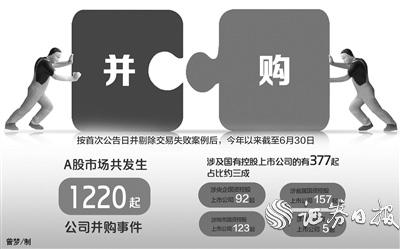 記者據(jù)同花順iFinD數(shù)據(jù)統(tǒng)計,按首次公告日并剔除交易失敗案例后,今年以來截至6月30日,A股市場共發(fā)生1220起公司并購事件,其中,涉及國有控股上市公司的有377起,占比約三成。