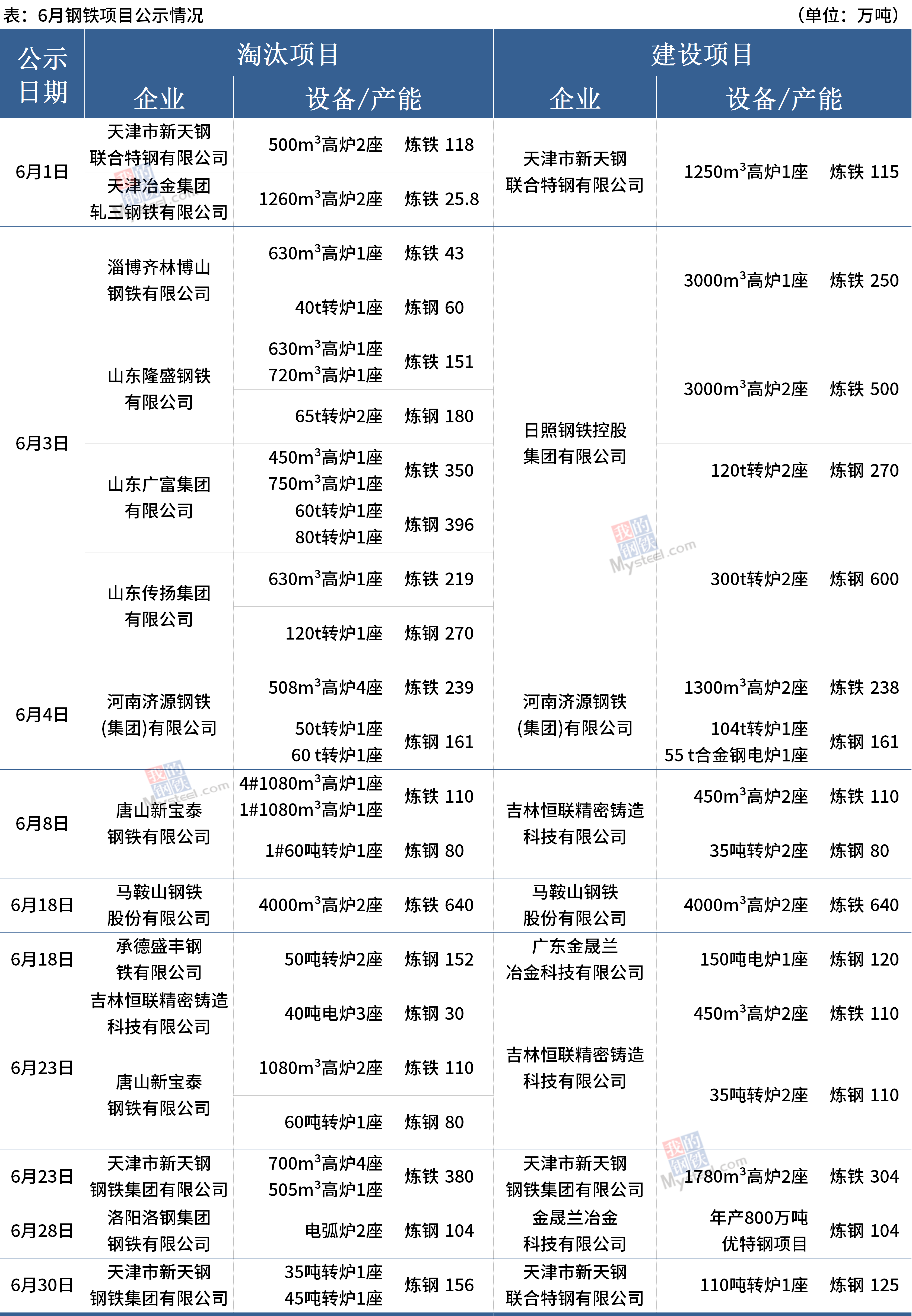 據(jù)Mysteel不完全統(tǒng)計,2021年6月有10個鋼鐵產(chǎn)能置換項目公示發(fā)布,涉及天津新天鋼、日照鋼鐵、濟源鋼鐵、吉林恒聯(lián)精密鑄造、廣東金晟蘭和馬鋼股份等,具體情況如下: