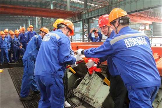 圖為中天特鋼領(lǐng)導(dǎo)萬(wàn)文華、葉玉奎帶頭合力擰緊大盤(pán)卷項(xiàng)目的第一顆螺母