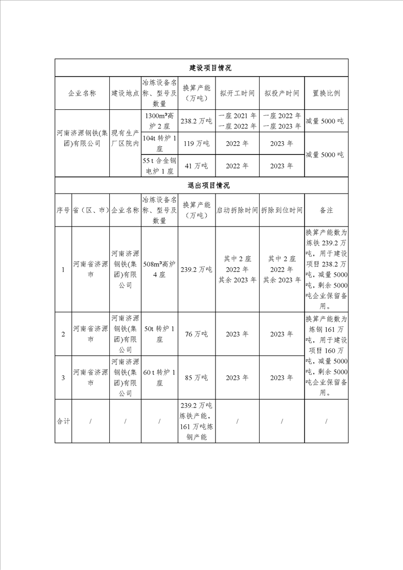 河南濟(jì)源鋼鐵(集團(tuán))有限公司建設(shè)項(xiàng)目產(chǎn)能置換方案公告