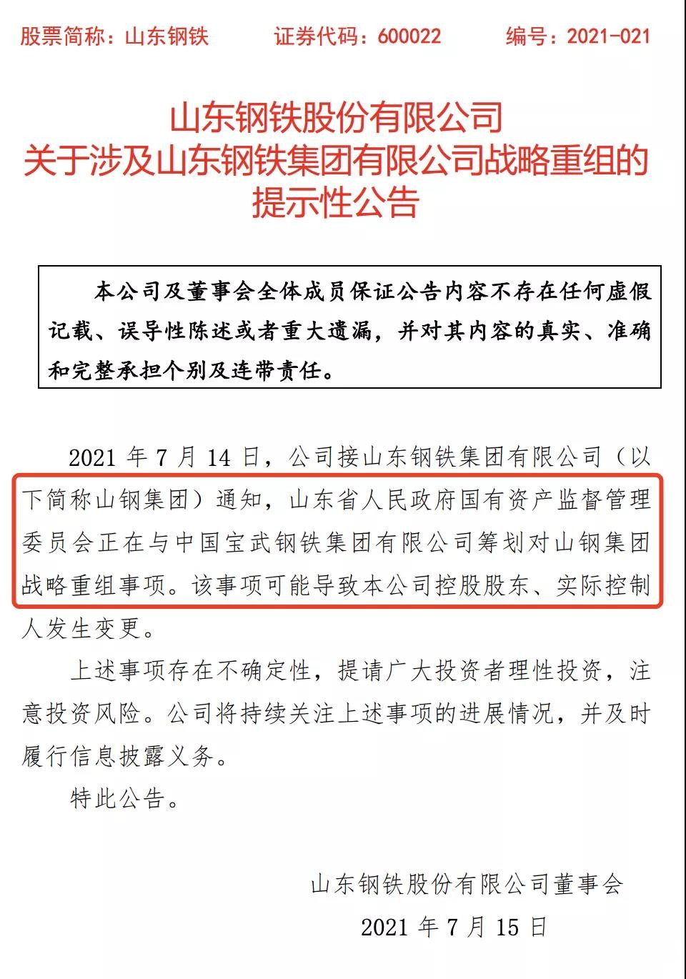 同時(shí),2021年7月14日晚間,山東鋼鐵突發(fā)公告,公司接山東鋼鐵集團(tuán)有限公司(山鋼集團(tuán))通知,山東省人民政府國(guó)有資產(chǎn)監(jiān)督管理委員會(huì)正在與中國(guó)寶武鋼鐵集團(tuán)有限公司籌劃對(duì)山鋼集團(tuán)戰(zhàn)略重組事項(xiàng)。該事項(xiàng)可能導(dǎo)致本公司控股股東、實(shí)際控制人發(fā)生變更。