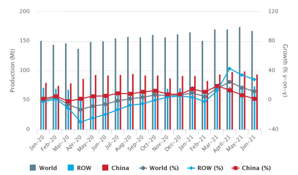 注:左軸:產(chǎn)量,百萬(wàn)噸;右軸:同比增幅,%;下標(biāo):全球、除中國(guó)外、中國(guó)、世界(%)除中國(guó)外(%)、中國(guó)(%)