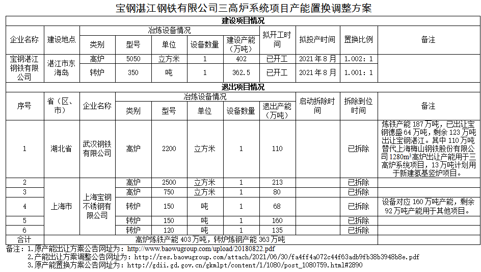 按照《國務(wù)院關(guān)于化解產(chǎn)能嚴重過剩矛盾的指導(dǎo)意見》(國發(fā)〔2013〕41號)、《國務(wù)院關(guān)于鋼鐵行業(yè)化解過剩產(chǎn)能實現(xiàn)脫困發(fā)展的意見》(國發(fā)〔2016〕6號)和《工業(yè)和信息化部關(guān)于印發(fā)鋼鐵行業(yè)產(chǎn)能置換實施辦法的通知》(工信部原〔2021〕46號)的要求,經(jīng)企業(yè)申請、湛江市工業(yè)和信息化主管部門審核、我廳審核并進行網(wǎng)上公示無異議,現(xiàn)將寶鋼湛江鋼鐵有限公司三高爐項目產(chǎn)能置換調(diào)整方案予以通告。同時,撤銷《廣東省經(jīng)濟和信息化委關(guān)于寶鋼湛江鋼鐵有限公司三高爐系統(tǒng)建設(shè)項目產(chǎn)能置換方案的通告》(廣東省經(jīng)濟和信息化委 通告〔2018〕78號)。