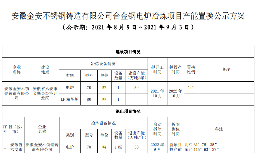 按照《國(guó)務(wù)院關(guān)于化解產(chǎn)能嚴(yán)重過(guò)剩矛盾的指導(dǎo)意見》《國(guó)務(wù)院關(guān)于鋼鐵行業(yè)化解過(guò)剩產(chǎn)能實(shí)現(xiàn)脫困發(fā)展的意見》和《鋼鐵行業(yè)產(chǎn)能置換實(shí)施辦法》要求,現(xiàn)將安徽金安不銹鋼鑄造有限公司合金鋼電爐冶煉項(xiàng)目產(chǎn)能置換方案予以公示,歡迎社會(huì)公眾進(jìn)行監(jiān)督。