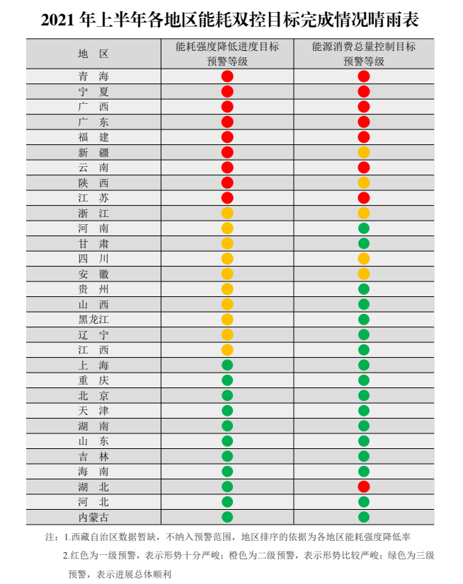 為貫徹落實黨中央、國務院關于強化能耗雙控的決策部署,加強能耗雙控形勢分析預警,根據(jù)上半年各地能源消費情況,我們制定了《2021年上半年各地區(qū)能耗雙控目標完成情況晴雨表》,現(xiàn)印發(fā)給你們。