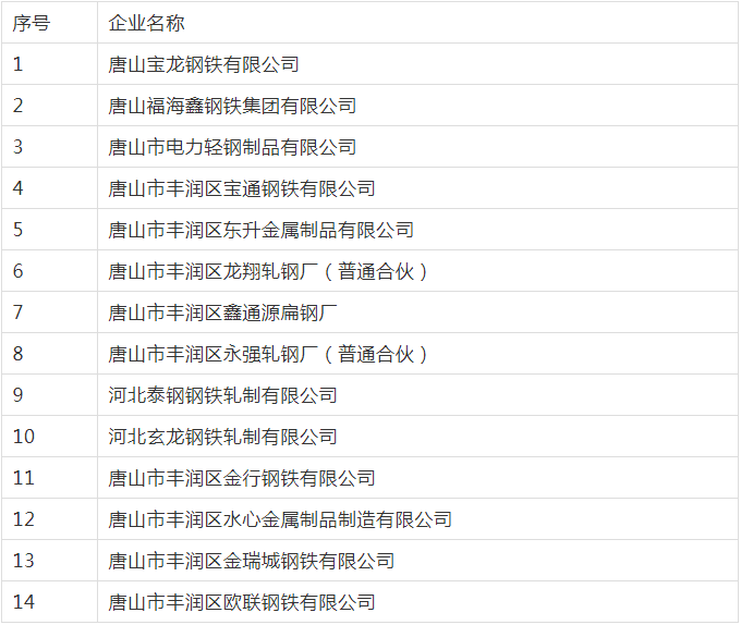 按照《唐山市獨立軋鋼行業(yè)整治提升工作方案》,唐山市生態(tài)環(huán)境局組織鋼鐵行業(yè)專家對我市部分獨立軋鋼企業(yè)進行了現(xiàn)場驗收,現(xiàn)將通過環(huán)保整治提升驗收的企業(yè)名單予以公示。