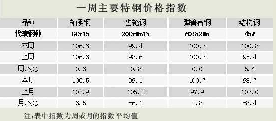 中信泰富特鋼集團(tuán)營銷管理部在跟蹤調(diào)研中獲悉,本周優(yōu)特鋼市場價格呈上漲態(tài)勢。除彈簧扁鋼價格與上周持平外,軸承鋼、齒輪鋼、結(jié)構(gòu)鋼價格指數(shù)分別比上周上升0.3點(diǎn)、0.8點(diǎn)、5.4點(diǎn)。從月度指數(shù)變化情況來看,齒輪鋼、結(jié)構(gòu)鋼價格指數(shù)分別比上月下降6.1點(diǎn)、8.4點(diǎn),彈簧扁鋼、軸承鋼價格指數(shù)分別比上月上升2.8點(diǎn)、3.5點(diǎn)。