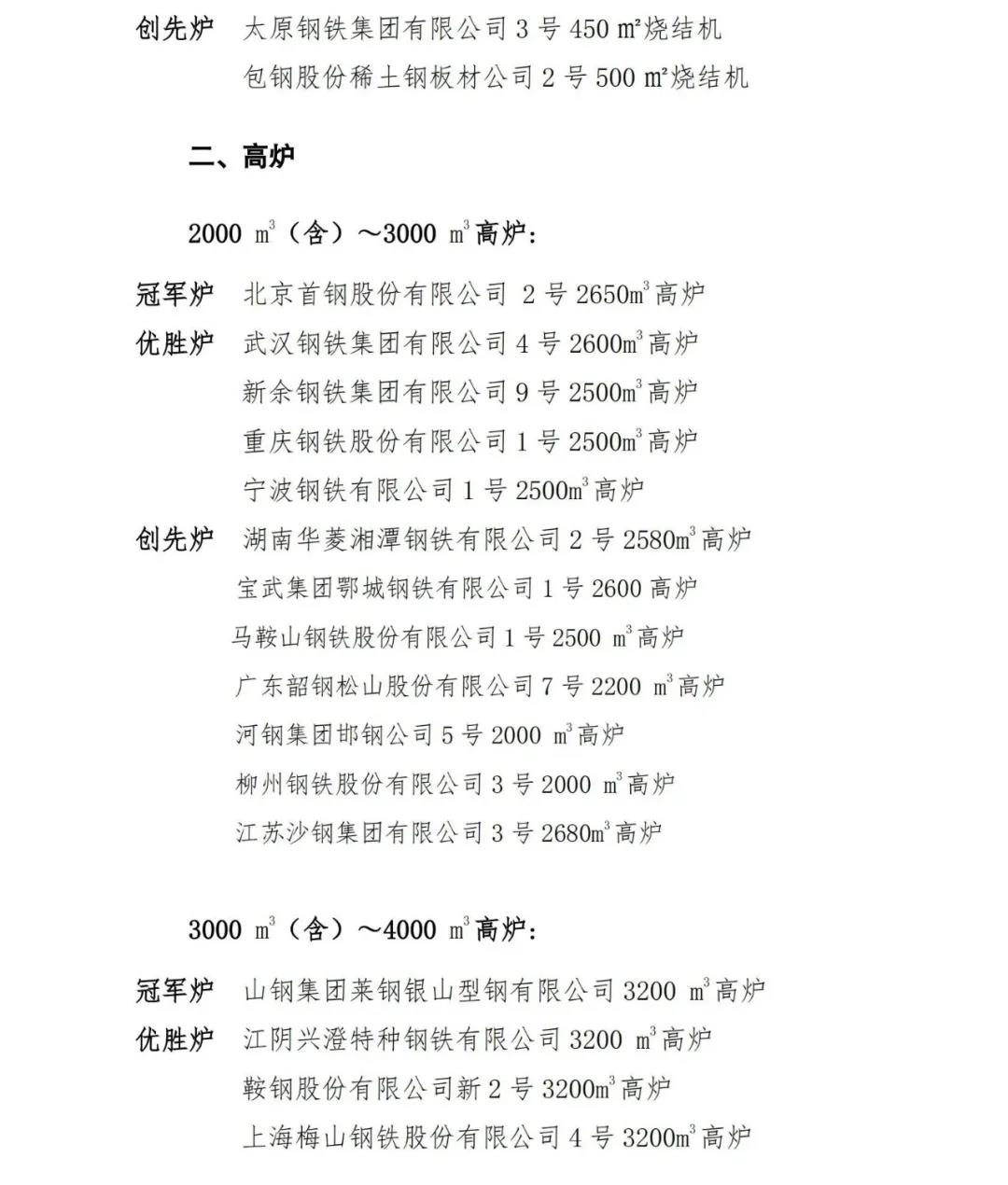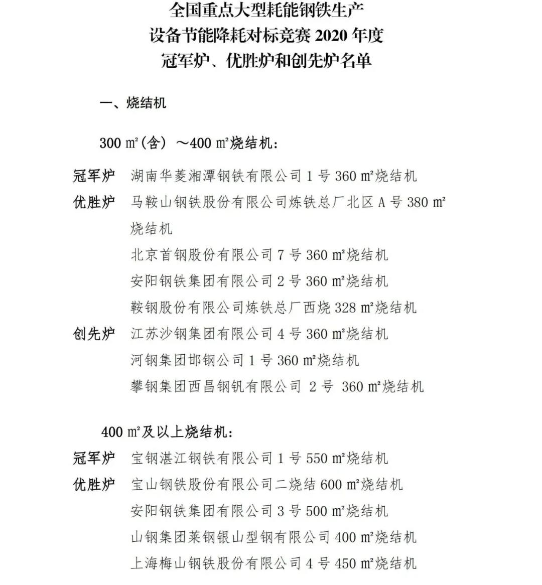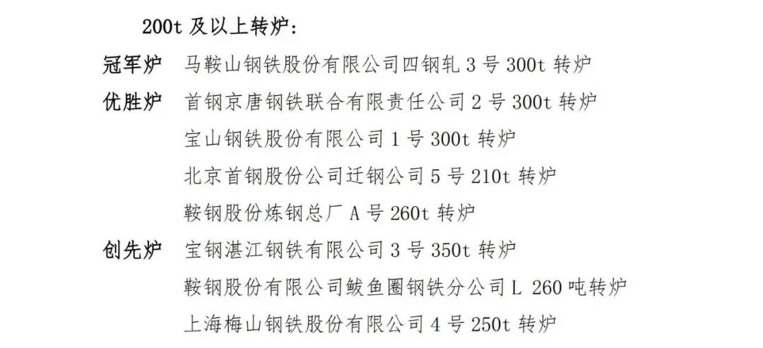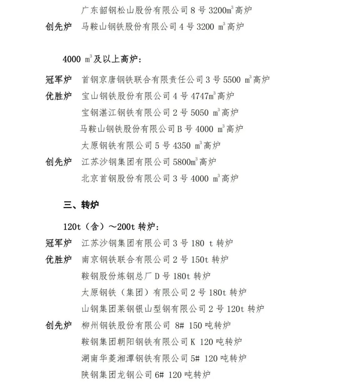 在各參賽企業(yè)和廣大職工的共同努力下,2020年度競賽工作已經(jīng)順利完成。經(jīng)競賽專家組評審和競賽領(lǐng)導(dǎo)小組研究,并在中國機械冶金建材工會全國委員會和中國鋼鐵工業(yè)協(xié)會網(wǎng)站進行了7天公示,最終評選出年度冠軍爐、優(yōu)勝爐和創(chuàng)先爐?,F(xiàn)對獲獎單位進行通報,具體名單附后。