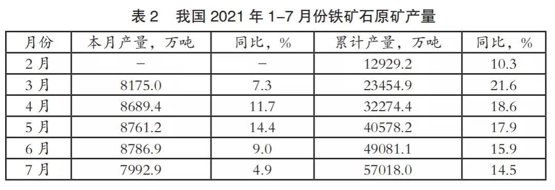 今年以來我國鐵礦石產(chǎn)量明顯增長,月度產(chǎn)量始終保持較大幅度增長,累計產(chǎn)量始終保持兩位數(shù)增長。1-7月份累計產(chǎn)量達(dá)到5.7億噸,同比增長14.5%,年化產(chǎn)量將達(dá)到9.77億噸,2018年以來首次接近10億噸,見表2。