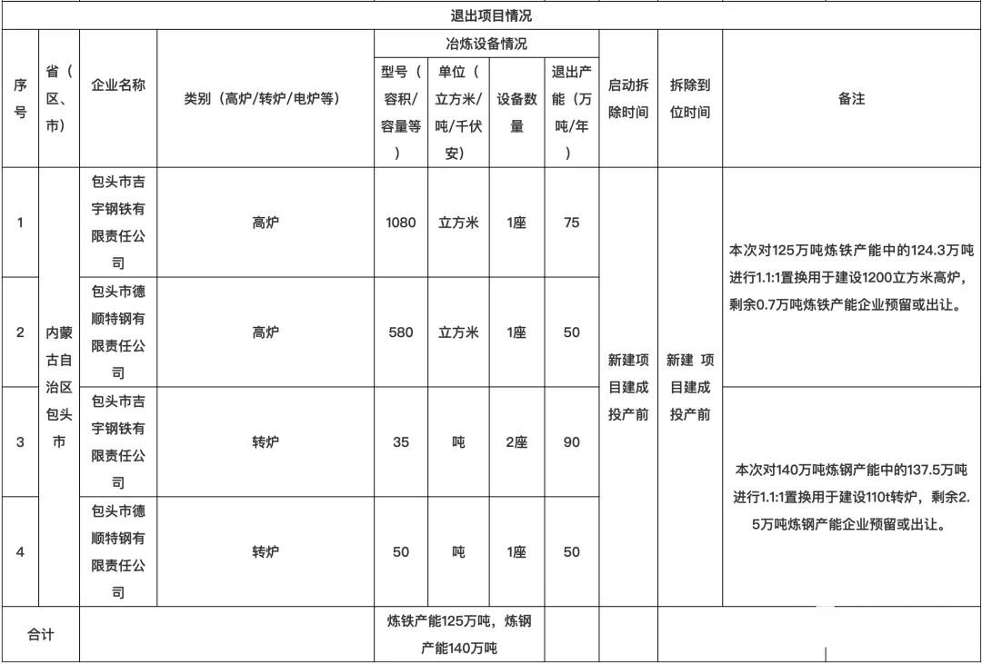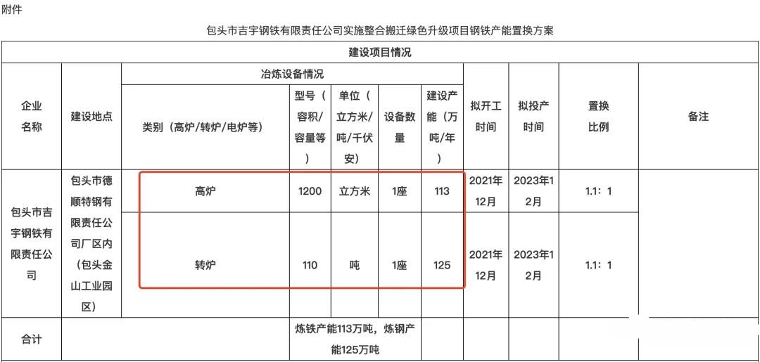 內(nèi)蒙古自治區(qū)工業(yè)和信息化廳日前發(fā)布公示,包頭市吉宇鋼鐵有限責(zé)任公司將實(shí)施整合搬遷綠色升級(jí)項(xiàng)目,產(chǎn)能來(lái)源于吉宇鋼鐵、德順特鋼兩家鋼廠,新建1200立高爐1座,110噸轉(zhuǎn)爐1座!公示內(nèi)容如下: