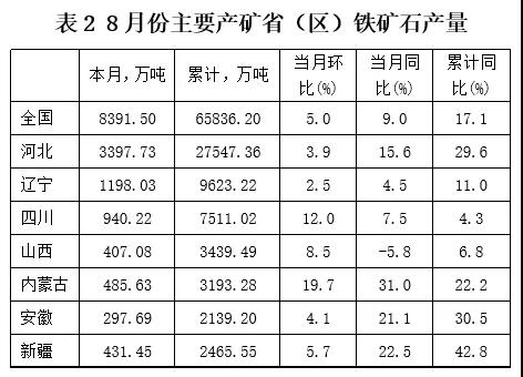 今年以來(lái)我國(guó)鐵礦石產(chǎn)量明顯增長(zhǎng),月度產(chǎn)量始終保持較大幅度增長(zhǎng),累計(jì)產(chǎn)量始終保持兩位數(shù)增長(zhǎng)(見(jiàn)表1)。據(jù)國(guó)家統(tǒng)計(jì)局?jǐn)?shù)據(jù),8月份全國(guó)鐵礦石原礦產(chǎn)量為8391.5萬(wàn)噸,同比增長(zhǎng)5.6%;1-8月份累計(jì)產(chǎn)量達(dá)6.58億噸,同比增長(zhǎng)14.2%,年化產(chǎn)量將達(dá)到9.87億噸,2018年以來(lái)首次接近10億噸。