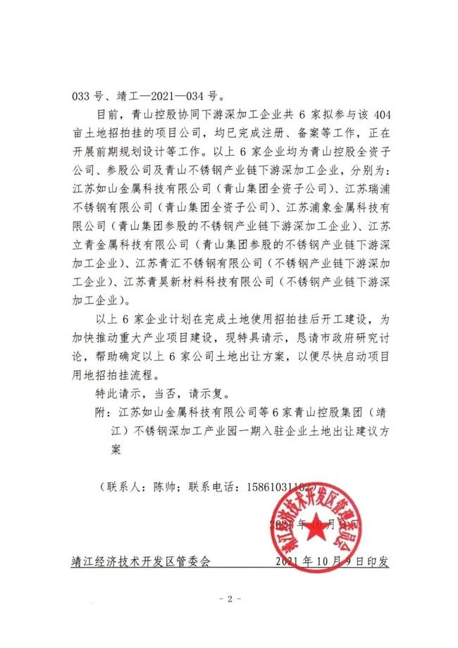 具體包括:江蘇如山金屬科技有限公司(青山集團(tuán)全資子公司)、江蘇瑞浦不銹鋼有限公司(青山集團(tuán)全資子公司)、江蘇浦象金屬科技有限公司(青山集團(tuán)參股的不銹鋼產(chǎn)業(yè)鏈下游深加工企業(yè))、江蘇立青金屬科技有限公司(青山集團(tuán)參股的不銹鋼產(chǎn)業(yè)鏈下游深加工企業(yè))、江蘇青匯不銹鋼有限公司(不銹鋼產(chǎn)業(yè)鏈下游深加工企業(yè))、江蘇青昊新材料科技有限公司(不銹鋼產(chǎn)業(yè)鏈下游深加工企業(yè)),上述六家企業(yè)計劃在完成土地使用招拍掛后開工建設(shè)。