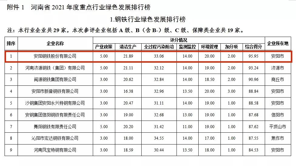 10月29日起,河南省2021年度重點(diǎn)行業(yè)綠色發(fā)展排行榜公示本年度榜單,對(duì)20個(gè)重點(diǎn)行業(yè)790家重點(diǎn)企業(yè)進(jìn)行了排名,其中鋼鐵行業(yè)綠色發(fā)展排行榜,“安陽(yáng)鋼鐵”以95.95綜合得分位列全省第一,濟(jì)源鋼鐵以93.24綜合得分位列全省第二,閩源鋼鐵以90.96綜合得分位列全省第三。