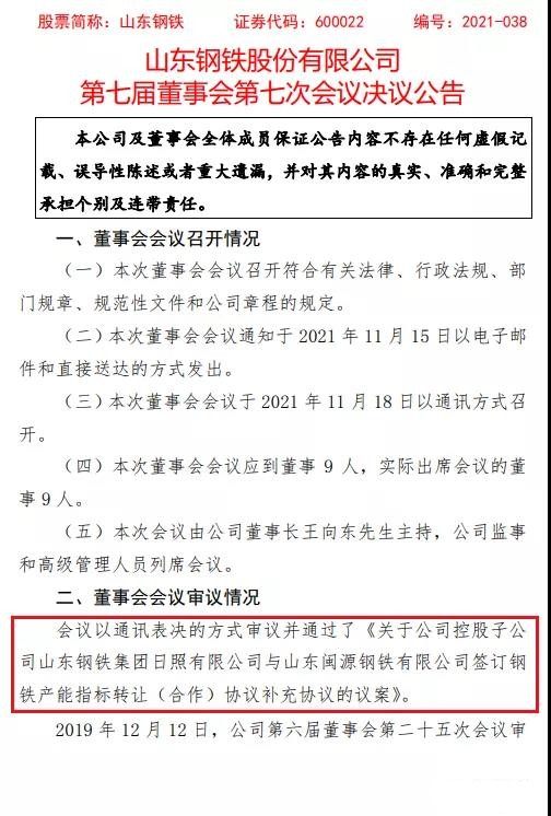 2019年12月12日,公司第六屆董事會第二十五次會議審議通過了《關(guān)于控股子公司山東鋼鐵集團日照有限公司購買山東閩源鋼鐵有限公司鋼鐵產(chǎn)能指標的議案》,詳見《山東鋼鐵股份有限公司關(guān)于控股子公司山東鋼鐵集團日照有限公司購買山東閩源鋼鐵有限公司鋼鐵產(chǎn)能指標的公告》(2019-053)。公司控股子公司山東鋼鐵集團日照有限公司(以下簡稱“日照公司”)與山東閩源鋼鐵有限公司(以下簡稱“山東閩源鋼鐵”)于2019年12月29日簽訂了《山東閩源鋼鐵有限公司鋼鐵產(chǎn)能指標轉(zhuǎn)讓(合作)協(xié)議》。
