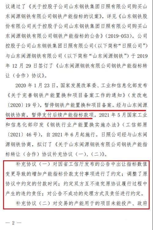 2020年1月23日,國家發(fā)展改革委、工業(yè)和信息化部發(fā)布《關(guān)于完善鋼鐵產(chǎn)能置換和項目備案工作的通知》(發(fā)改電〔2020〕19號),暫停鋼鐵產(chǎn)能置換和項目備案。經(jīng)與山東閩源鋼鐵協(xié)商,暫停支付后續(xù)產(chǎn)能指標款項。2021年5月國家工業(yè)和信息化部印發(fā)《鋼鐵行業(yè)產(chǎn)能置換實施辦法》(工信部原〔2021〕46號),自2021年6月起施行。日照公司經(jīng)與山東閩源鋼鐵協(xié)商,擬訂了《關(guān)于山東閩源鋼鐵有限公司鋼鐵產(chǎn)能指標轉(zhuǎn)讓(合作)協(xié)議補充協(xié)議(一)、(二)》。