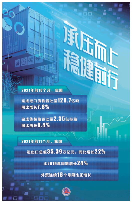 海關(guān)總署數(shù)據(jù)顯示,今年前11個月,中國進出口總值35.39萬億元,同比增長22%,比2019年同期增長24%,這也是中國外貿(mào)連續(xù)18個月同比正增長。