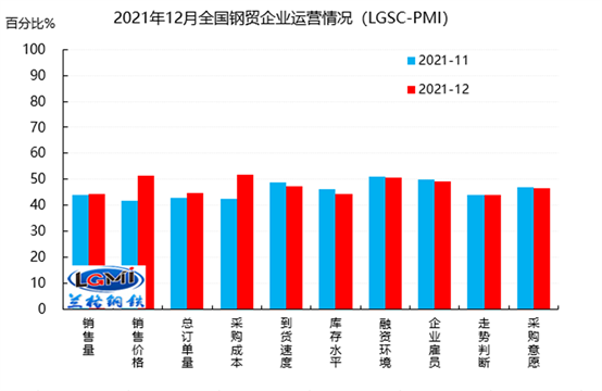 蘭格鋼鐵云商平臺統(tǒng)計發(fā)布的2021年12月份鋼鐵流通業(yè)PMI總指數(shù)為46.9%,比上月回升0.3個百分點。從分類指數(shù)看,構成鋼鐵流通業(yè) PMI的10個分類指數(shù)5降4升1平,其中到貨速度、庫存水平、融資環(huán)境、企業(yè)雇員和采購意愿5項指數(shù)下降,銷售量、銷售價格、總訂單量和采購成本4項指數(shù)上升,僅有走勢判斷1項指數(shù)持平。