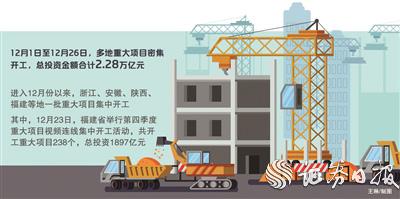 進(jìn)入12月份以來,浙江、安徽、陜西、福建等地一批重大項(xiàng)目集中開工。例如,12月23日,福建省舉行第四季度重大項(xiàng)目視頻連線集中開工活動(dòng),共開工重大項(xiàng)目238個(gè),總投資1897億元。此次集中開工,圍繞“兩新一重”建設(shè),圍繞優(yōu)化產(chǎn)業(yè)布局,福建省篩選出238個(gè)具有示范性、帶動(dòng)性的好項(xiàng)目、大項(xiàng)目。包括基礎(chǔ)設(shè)施項(xiàng)目44個(gè)、總投資382億元,產(chǎn)業(yè)項(xiàng)目158個(gè)、總投資1272億元,社會(huì)民生項(xiàng)目36個(gè)、總投資243億元。