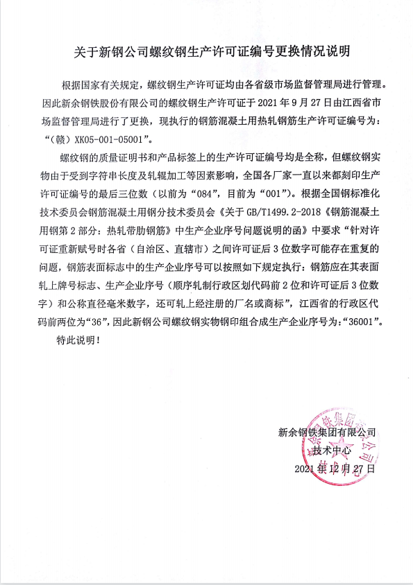 關(guān)于新鋼公司螺紋鋼生產(chǎn)許可證編號(hào)更換情況說(shuō)明