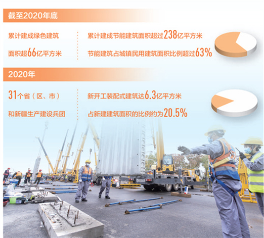 相比傳統(tǒng)現(xiàn)澆方式,裝配式建造不僅速度快,還能有效降低施工過程中的建筑垃圾排放,并且能減少揚(yáng)塵和噪聲等環(huán)境污染。數(shù)據(jù)顯示,2020年,31個(gè)?。▍^(qū)、市)和新疆生產(chǎn)建設(shè)兵團(tuán)新開工裝配式建筑達(dá)6.3億平方米,較2019年增長(zhǎng)50%,占新建建筑面積的比例約為20.5%。
