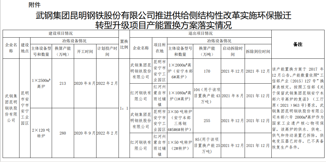 武鋼集團昆明鋼鐵環(huán)保搬遷轉(zhuǎn)型升級項目產(chǎn)能置換落實情況公告