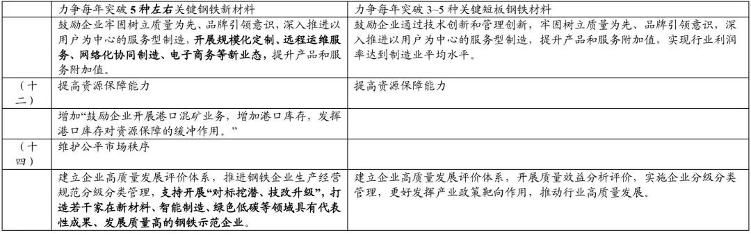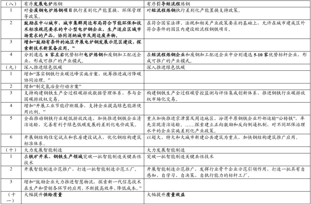 三是相關(guān)提法調(diào)整。《征求意見稿》中質(zhì)量效益目標(biāo)提出“產(chǎn)品質(zhì)量性能和穩(wěn)定性進(jìn)一步提升,鋼材實(shí)物質(zhì)量總體達(dá)到國際先進(jìn)水平”,《指導(dǎo)意見》調(diào)整為“高端鋼鐵產(chǎn)品供給能力大幅增強(qiáng),品種和質(zhì)量提檔升級(jí),每年突破5種左右關(guān)鍵鋼鐵材料,形成一批擁有較大國際影響力的企業(yè)品牌和產(chǎn)品品牌”?!吨笇?dǎo)意見》將兼并重組由《征求意見稿》的“推進(jìn)區(qū)域內(nèi)”調(diào)整為“鼓勵(lì)鋼鐵企業(yè)跨區(qū)域、跨所有制兼并重組”,并進(jìn)一步將“對(duì)短流程煉鋼執(zhí)行差別化產(chǎn)能置換支持政策”明確為“對(duì)全廢鋼電爐煉鋼項(xiàng)目執(zhí)行差別化產(chǎn)能置換、環(huán)保管理等政策”。