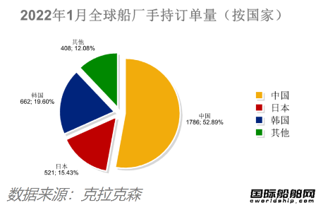 其中中國(guó)船廠手持訂單量為1786艘,共計(jì)38132724CGT,艘數(shù)占全球市場(chǎng)份額的52.89%,CGT占41.83%;日本船廠的手持訂單量為521艘,共計(jì)9258036CGT,艘數(shù)占全球市場(chǎng)份額的15.43%,CGT占10.15%;韓國(guó)船廠的手持訂單量為662艘,共計(jì)30686918CGT,艘數(shù)占全球市場(chǎng)份額的19.60%,CGT占33.66%。