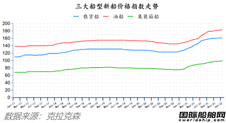 數(shù)據(jù)顯示,1月份散貨船新船價(jià)格指數(shù)與上月持平為162點(diǎn),油船和集裝箱船新船價(jià)格指數(shù)分別環(huán)比上升1點(diǎn)至183點(diǎn)和99點(diǎn)。