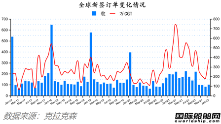 根據(jù)克拉克森最新數(shù)據(jù)統(tǒng)計(jì)(截至2022年2月10日),2022年1月份全球新簽訂單100艘,共計(jì)3799042CGT。與2021年12月份全球新簽訂單81艘,共計(jì)1799222CGT相比較,數(shù)量環(huán)比增加19艘,修正總噸環(huán)比上升111.15%。與2021年1月份全球新簽訂單198艘,共計(jì)2849883CGT相比較,數(shù)量同比減少98艘,修正總噸同比上升33.31%。