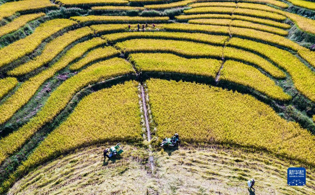2021年9月21日,湖北省秭歸縣沙鎮(zhèn)溪鎮(zhèn)村民在田間收獲高山冷水稻(無人機(jī)照片)。新華社發(fā)(向紅梅 攝)