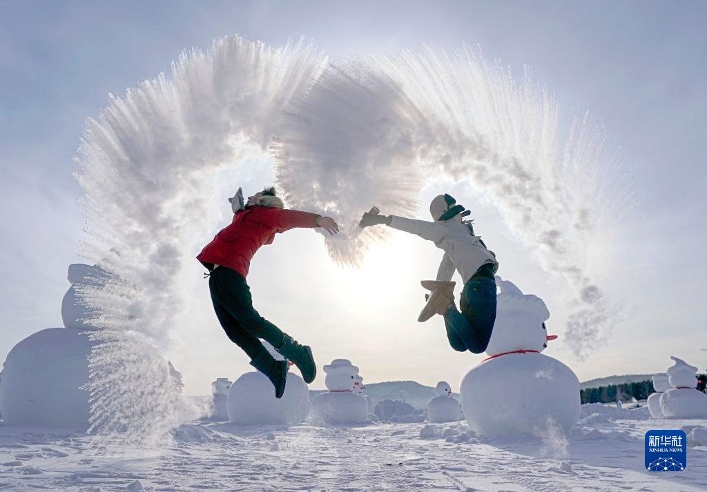 2019年1月24日,在黑龍江省漠河市北極村,游客體驗(yàn)“潑水成冰”游戲。新華社記者 才揚(yáng) 攝