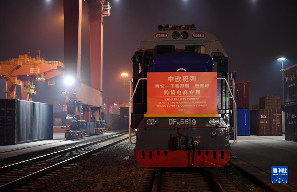 2021年12月31日晚,中歐班列長安號跨境電商專列在西安國際港站準(zhǔn)備出發(fā)開往德國曼海姆。新華社記者 李一博 攝