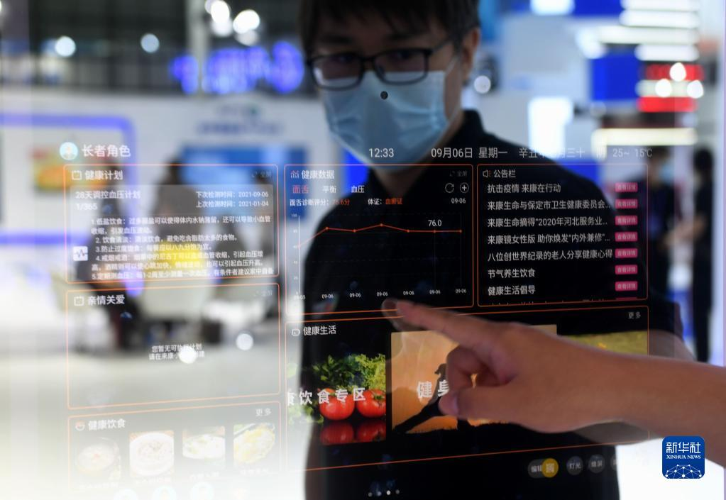 2021年9月6日,在河北石家莊舉行的2021中國國際數(shù)字經(jīng)濟(jì)博覽會上,工作人員在操作智能鏡子。新華社記者 王曉 攝