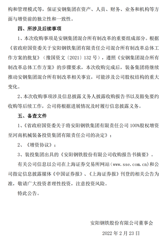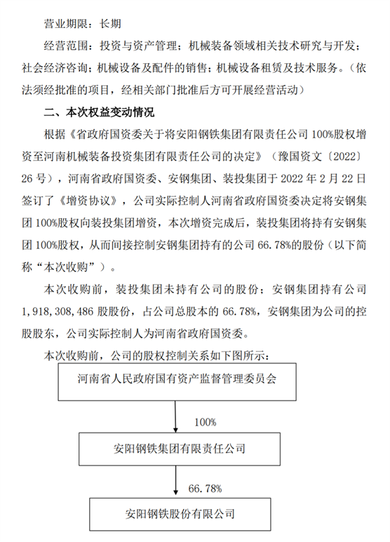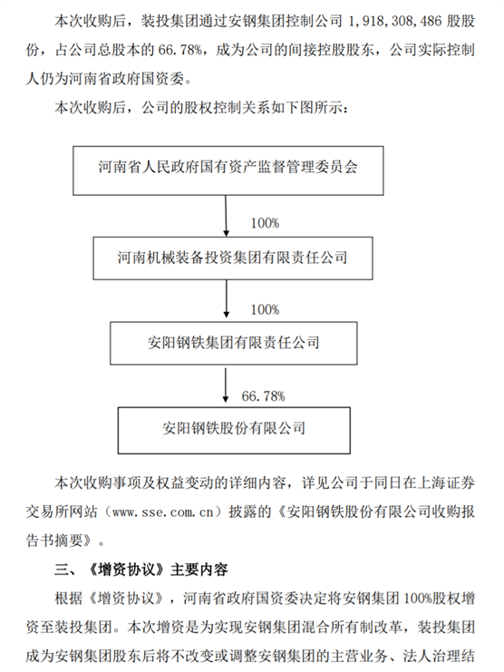 安陽(yáng)鋼鐵2月23日發(fā)布公告,河南省國(guó)資委將安鋼集團(tuán)100%股權(quán)增資至河南機(jī)械裝備投資集團(tuán)有限責(zé)任公司(簡(jiǎn)稱“裝投集團(tuán)”)。本次增資完成后,裝投集團(tuán)將持有安鋼集團(tuán)100%股權(quán),從而間接控制安鋼集團(tuán)持有的公司66.78%的股份。安鋼集團(tuán)作為公司的直接控股股東、河南省國(guó)資委作為公司的實(shí)際控制人未發(fā)生變化;裝投集團(tuán)將成為公司的間接控股股東。