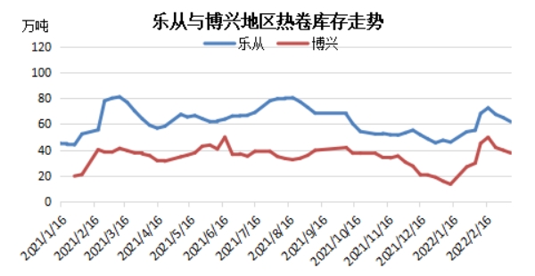 另外,從重點(diǎn)城市的庫存走勢情況也可以很好的反應(yīng)熱卷市場需求情況。截止到3月18日,樂從地區(qū)熱卷庫存社會(huì)庫存總量59.95萬噸,較2月底減少7.55萬噸,較采暖季前減少0.07萬噸;博興地區(qū)熱卷庫存為28.66萬噸,較2月底減少13.12萬噸,較采暖季前減少8.43萬噸。