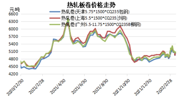 截止到3月18日,3月份天津地區(qū)熱卷均價(jià)5065元/噸,較2月份上漲144元/噸或2.92%;上海均價(jià)5120元/噸,上漲125元/噸或2.50%;樂從價(jià)格5143元/噸,上漲177元/噸或3.56%。3月份熱卷市場影響因素紛繁復(fù)雜,市場多跟隨政策面以及消息面波動(dòng),但整體來看終端需求支撐不足,市場供需面對于市場的影響話語權(quán)相對較弱。