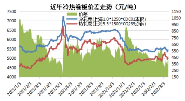 冷卷與熱卷走勢具有高度相關(guān)性,近期市場總體呈現(xiàn)寬幅震蕩格局。截止到3月18日,以上海地區(qū)為例,冷卷均價(jià)5470元/噸,環(huán)比微跌2元/噸。3月份以來冷卷-熱卷價(jià)差有所收窄,兩者價(jià)差一直在290-430元/噸之間波動(dòng),熱卷向冷卷加工暫無利潤,兩者傳導(dǎo)處于不暢的局面,也側(cè)面反映了熱卷市場需求端的弱勢。