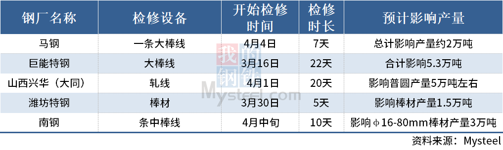 據(jù)Mysteel不完全統(tǒng)計,4月初有5家鋼廠發(fā)布檢修計劃,其中檢修時間最長的是巨能特鋼,計劃3月16日-4月8日大棒停產(chǎn),影響產(chǎn)量0.23萬噸/日,合計影響5.3萬噸。