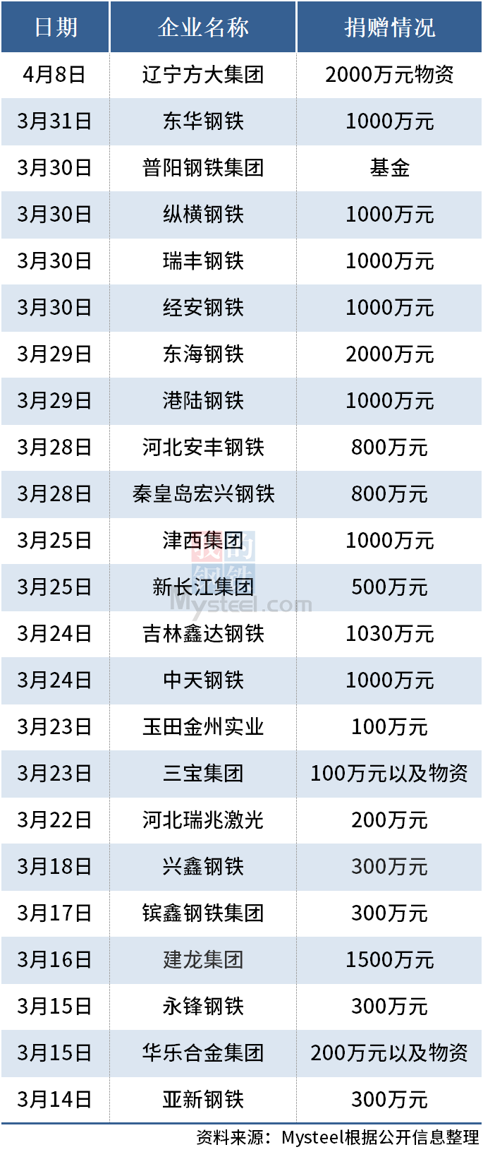 面對來勢洶洶的新冠肺炎疫情,我國各大鋼鐵企業(yè)迅速行動,通過捐款、捐物等方式,再次體現(xiàn)了企業(yè)的責(zé)任擔(dān)當(dāng)與大愛。據(jù)Mysteel不完全統(tǒng)計(jì),截至4月8日,國內(nèi)鋼鐵及相關(guān)企業(yè)捐贈17430萬元資金及物資。