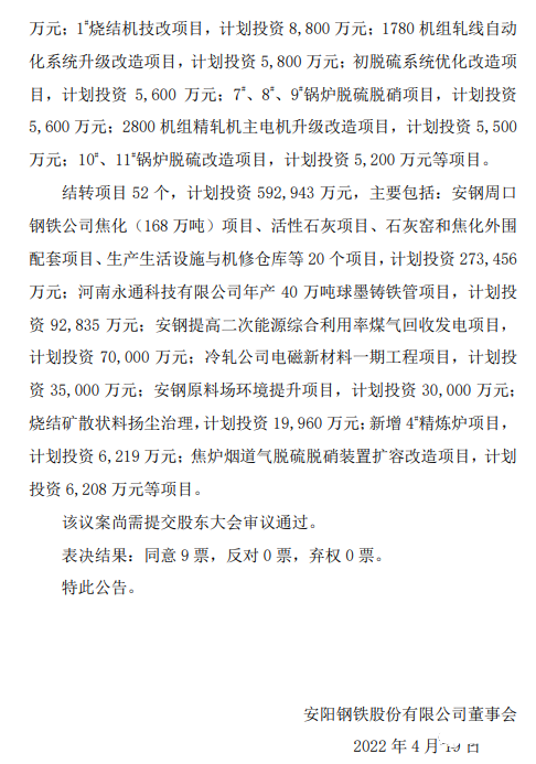 4月19日,安陽鋼鐵公告稱,公司第九屆董事會第八次會議審議通過《公司2022年度固定資產(chǎn)投資計(jì)劃的議案》等。