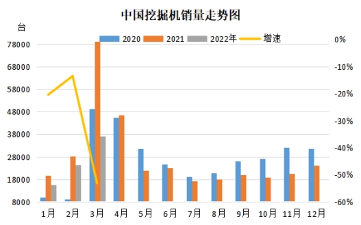 2022年3月份,26家挖掘機制造企業(yè)銷售各類挖掘機37085臺,同比下降53.1%;其中國內(nèi)26556臺,同比下降63.6%;出口10529臺,同比增長73.5%。2022年1-3月,共銷售挖掘機77175臺,同比下降39.2%;其中國內(nèi)51886臺,同比下降54.3%;出口25289臺,同比增長88.6%。