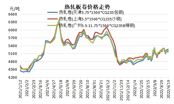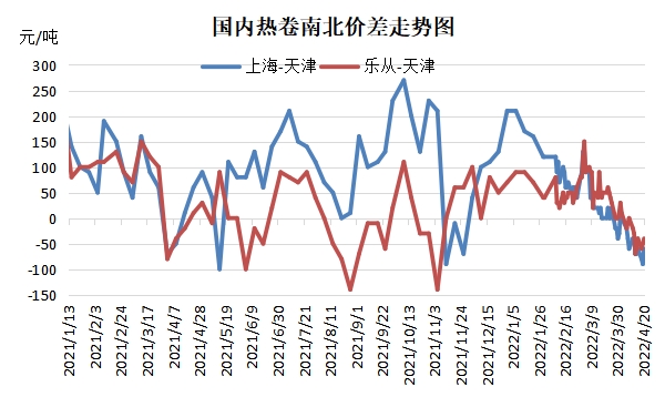熱卷市場購銷仍維持本地區(qū)域流通,南北流通仍未開啟,這也就造成了熱卷市場價差難以拉開。疊加需求偏弱以及華東區(qū)域疫情因素影響,也在一定程度上利空熱卷市場操作風(fēng)險有所增加,貿(mào)易商謹(jǐn)慎購銷的情緒愈加明顯。整體來看,華北與華東地區(qū)熱卷維持倒掛的局面,以4月20日當(dāng)天的價格來看,天津熱卷價格普遍高于上海與樂從價格。