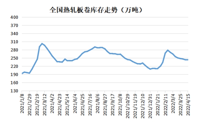 受疫情因素影響,部分鋼廠成材外運受阻,熱卷社會庫結(jié)束消庫的局面,庫存小幅累積。據(jù)蘭格云商平臺監(jiān)測數(shù)據(jù)顯示,截止到4月15日熱卷現(xiàn)貨社會庫存總量為243.70萬噸,較上周增加0.65萬噸,較3月底減少3.91萬噸,同比增加7.65萬噸。