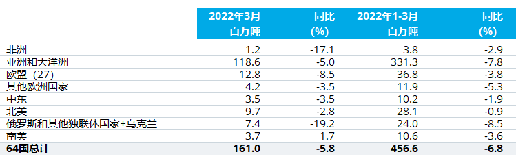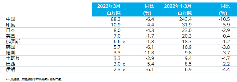 2022年3月,全球64個(gè)納入世界鋼鐵協(xié)會(huì)統(tǒng)計(jì)國(guó)家或地區(qū)的粗鋼產(chǎn)量為1.610億噸,同比下降5.8%。